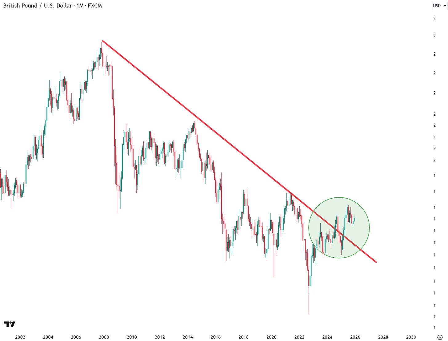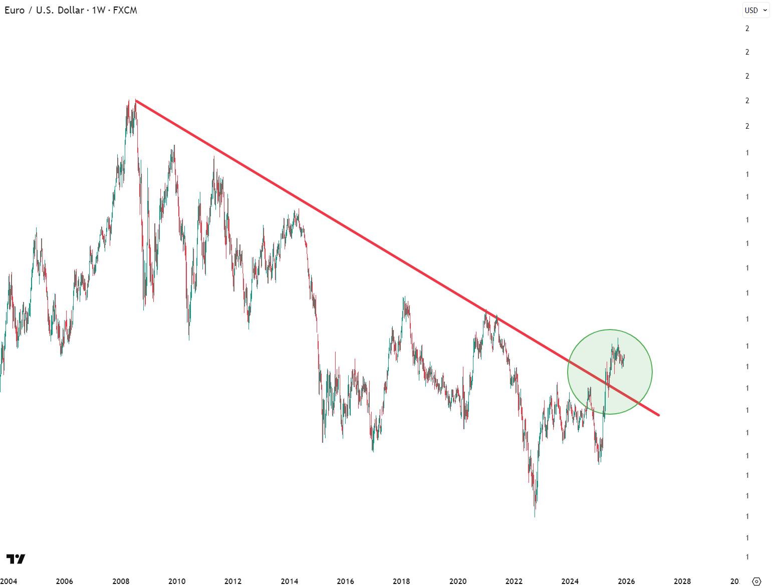 The euro looks like it may be breaking out from a nearly two-decade long downtrend: