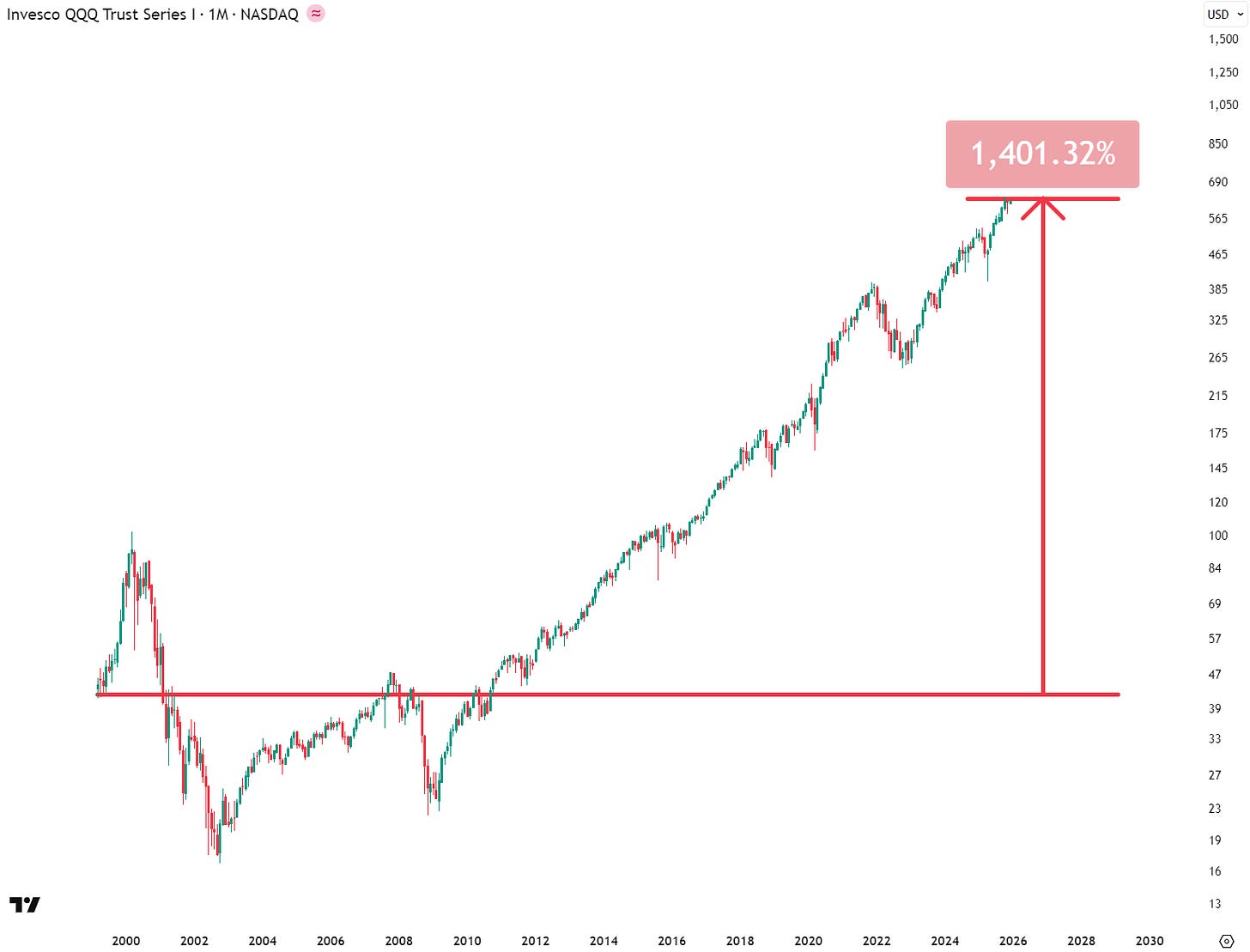 Here’s a chart of the NASDAQ (QQQ) measured against the U.S. dollar, up 1,400% since launch of the ETF in 1999: