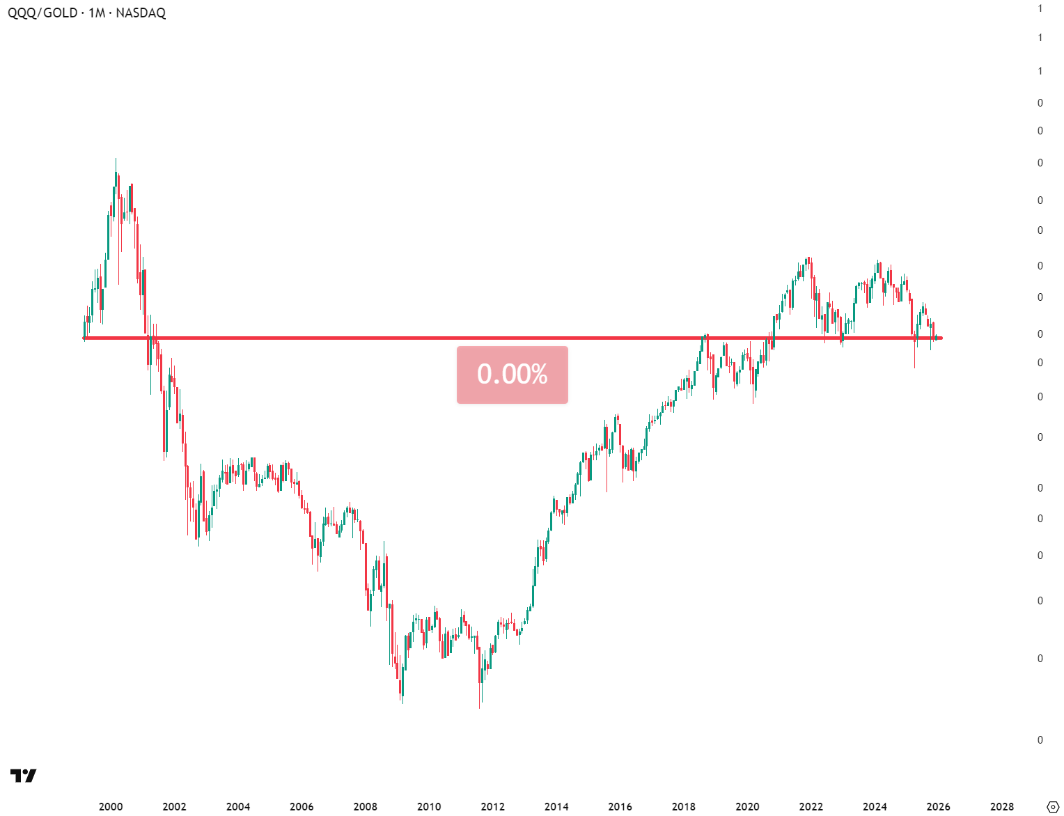 Here’s a chart of the NASDAQ (QQQ) measured against gold, flat for nearly three decades: