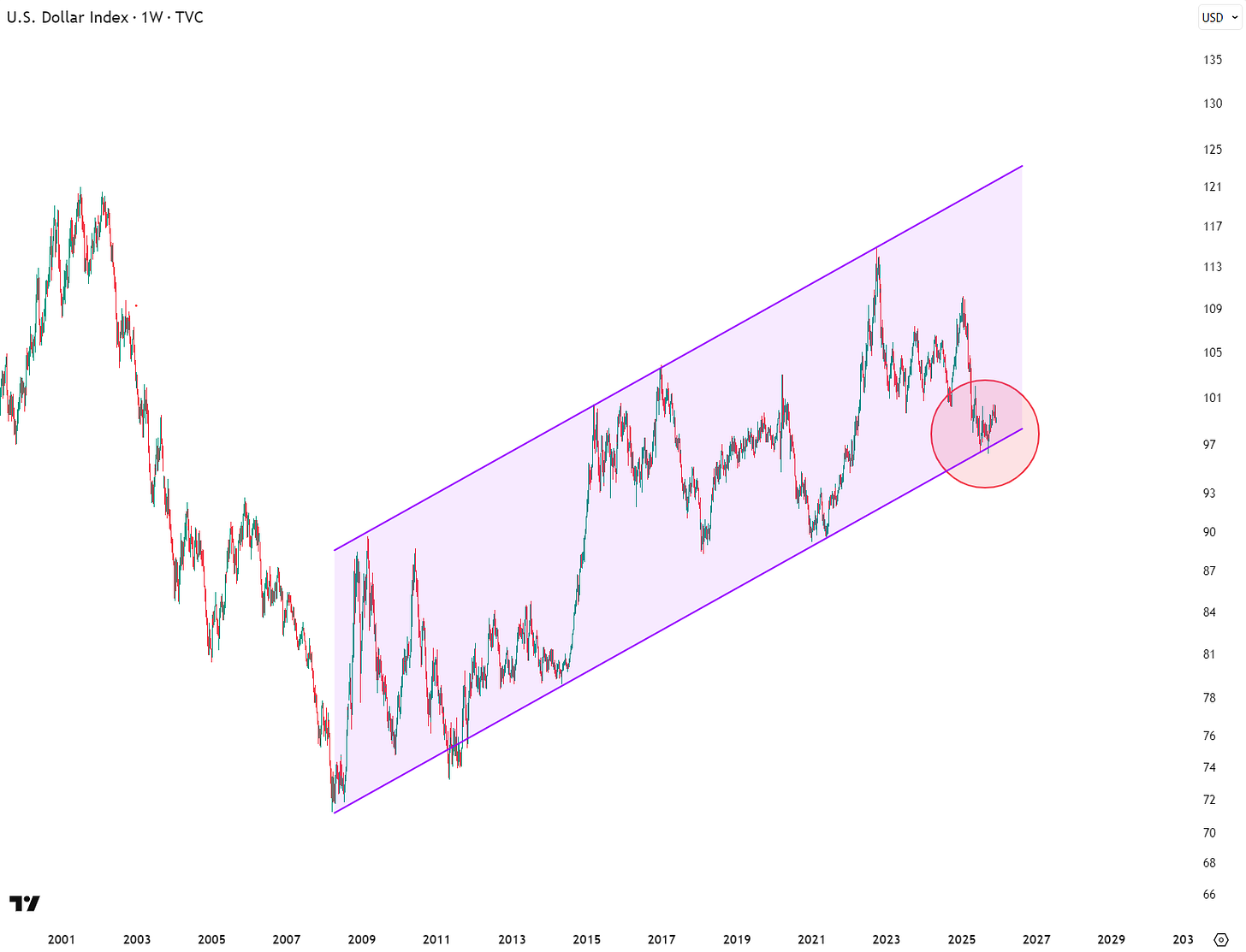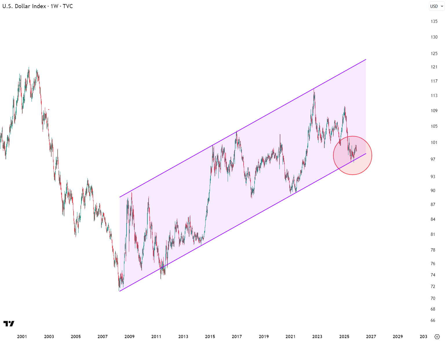 Since the beginning of the 2008 financial crisis, the dollar index DXY (measured against a basket of other currencies) has been in a steady uptrend. Today, the dollar is near the lower boundary of that uptrend channel.