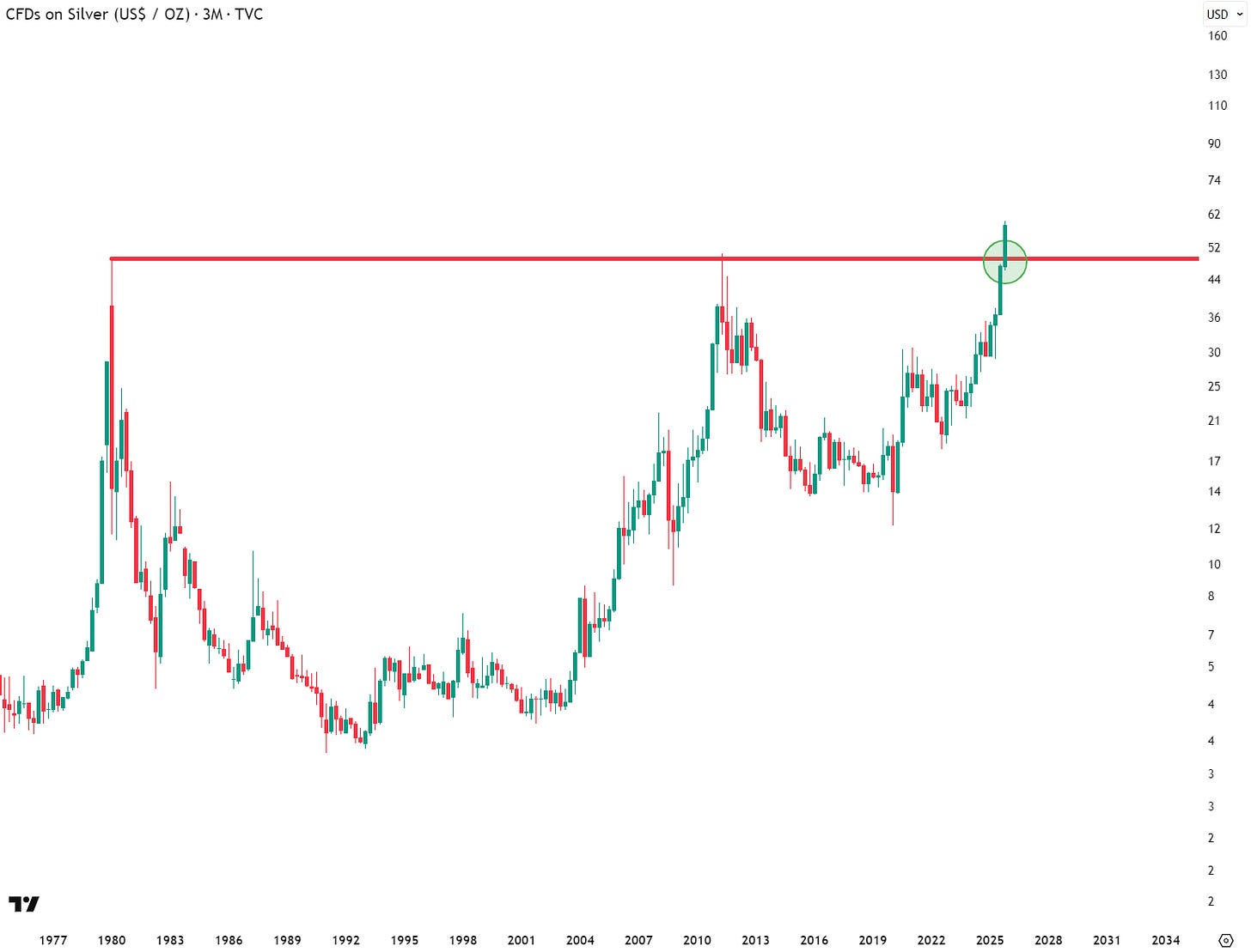 Lastly, the chart of silver has invalidated the potential double top I was watching and is confirming a significant technical breakout against 45+ year resistance.